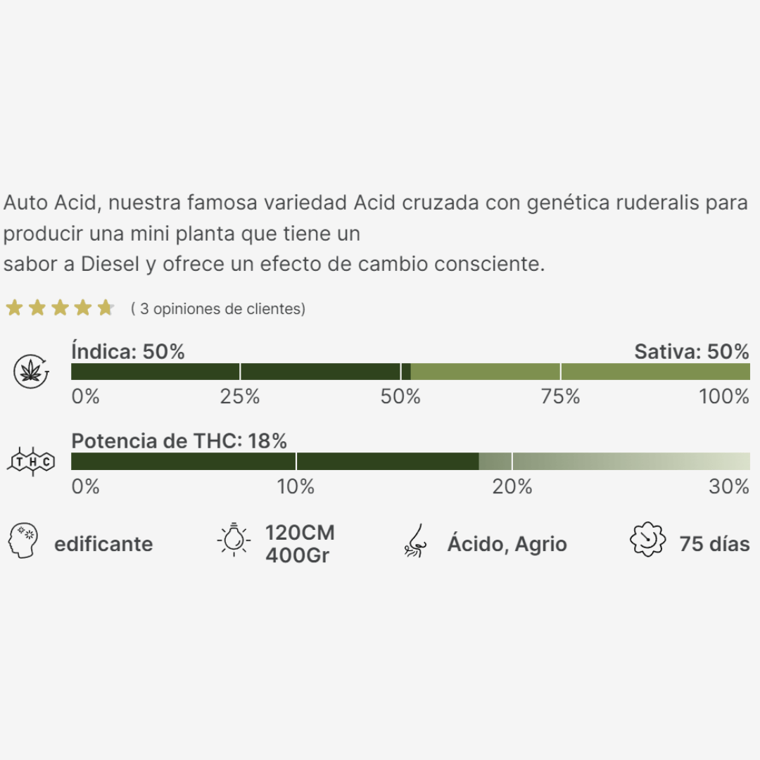 Al igual que su homóloga feminizada, Acid, es una explosión de sabor y potencia en una variedad autofloreciente. Con todo el vigor de la Acid, ofrece un sabor distintivo y un aroma intensamente satisfactorio, especialmente para los amantes de Diesel que buscan una experiencia rápida y afrutada.