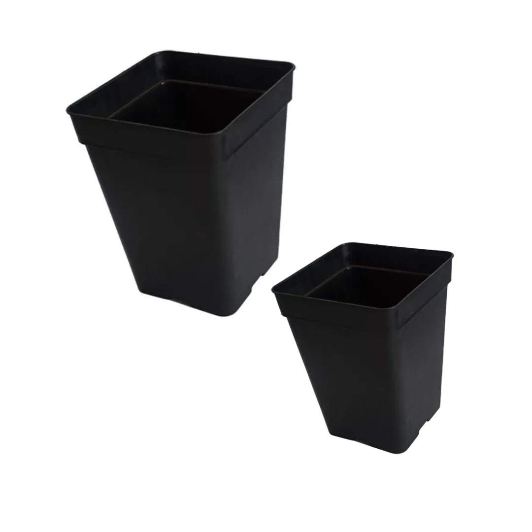 Matera plástica negra cuadrada de 7 litros, resistente y funcional. Ideal para plantas medianas en huertos, jardines o viveros. Con drenaje y durabilidad.