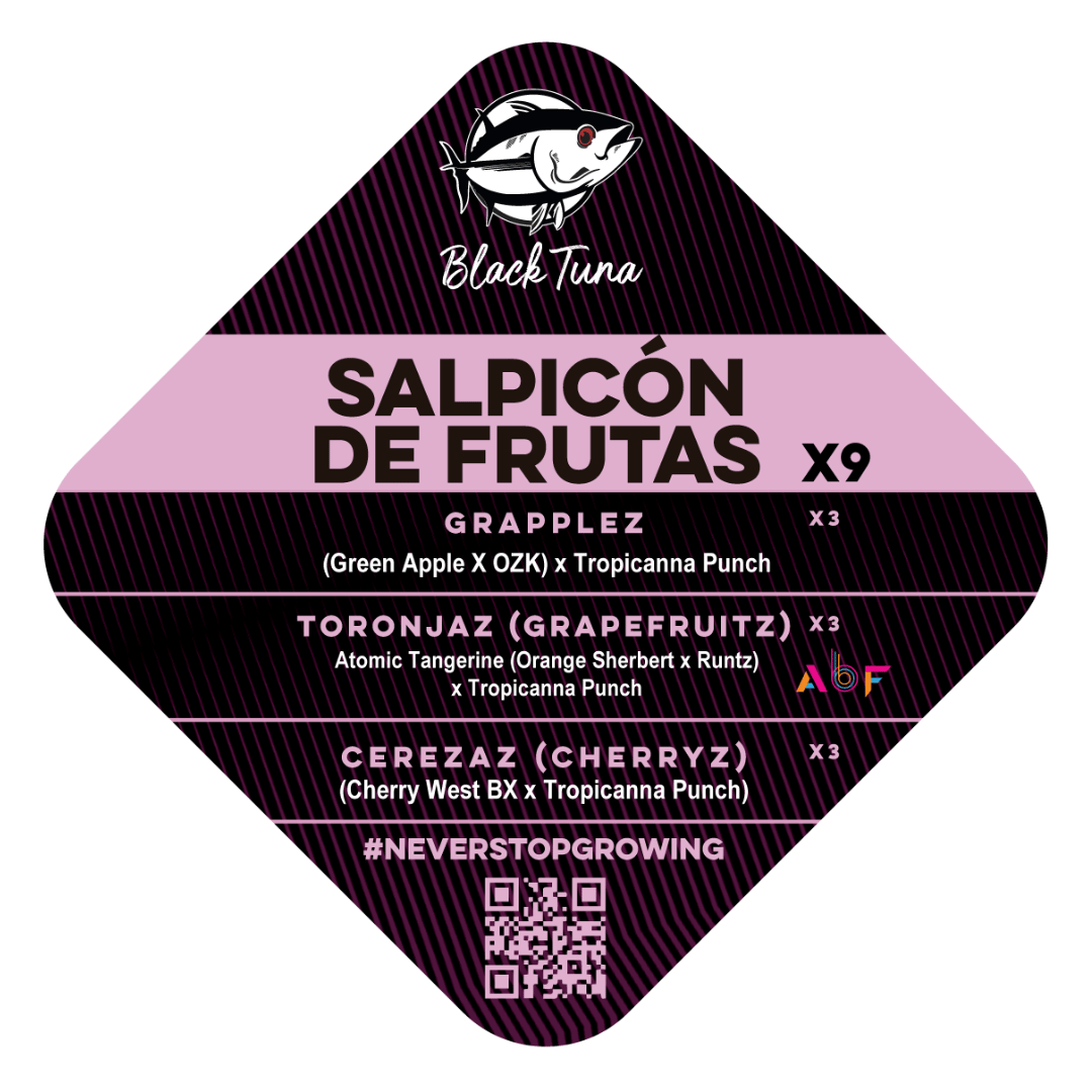 El Popurrí Salpicón de Frutas reúne tres genéticas seleccionadas por Black Tuna para ofrecer una experiencia sensorial completa. Este pack incluye Grapplez, Toronjaz, y Cerezaz, cada una con su propio perfil afrutado y efectos únicos. Esta combinación de cepas brinda una oportunidad inigualable para disfrutar de sabores intensos y equilibrados, ideales para los amantes del cannabis frutal.